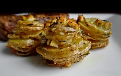Déposer les tranches de pommes de terre en étage dans un moule à muffins (pour que ce soit la hauteur d’une pomme de terre).