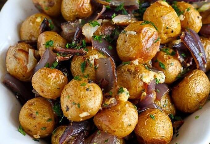 Cette recette de pommes de terre rôties devient pratiquement une dépendance en ajoutant des oignons, du paprika fumé et du fromage bleu crémeux.