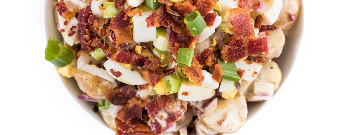 Dans un bol de taille moyenne, fouetter les ingrédients de la vinaigrette : la mayonnaise, le vinaigre, la moutarde, le sucre, le sel et le poivre. Verser la vinaigrette sur les pommes de terre, le bacon et les œufs, puis mélanger pour tout bien enduire. Saupoudrer l’oignon vert juste avant de servir le tout chaud, à température ambiante, ou froid.