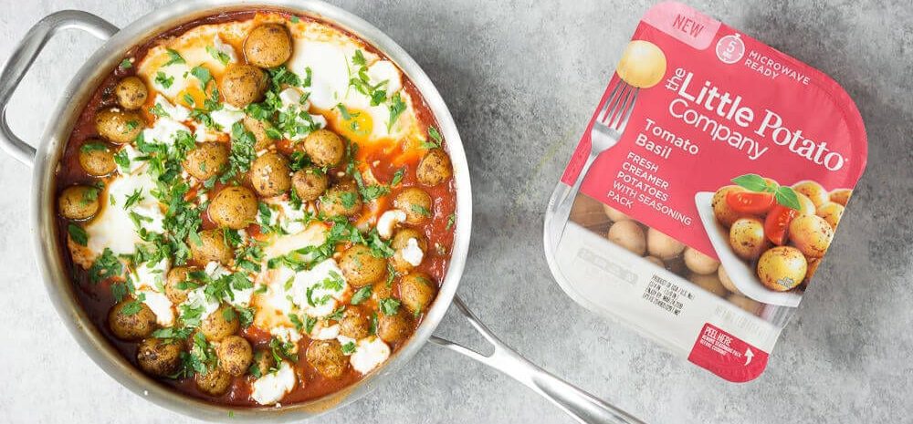 Des œufs pochés dans une sauce tomate avec des pommes de terre et des épinards. Le parfait souper ou déjeuner végétarien.