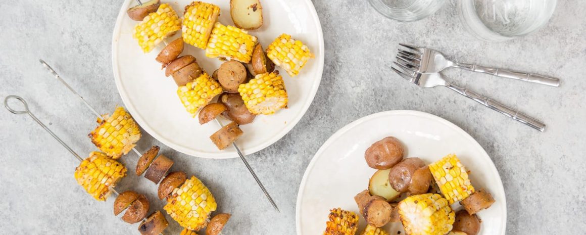 Thread the potatoes, corn, and sliced sausages onto either wooden or metal kebabs, then place kebab either on a foil-lined baking sheet, cutting board, or in a large glass or metal roasting pan while you continue making the rest of the kebabs.