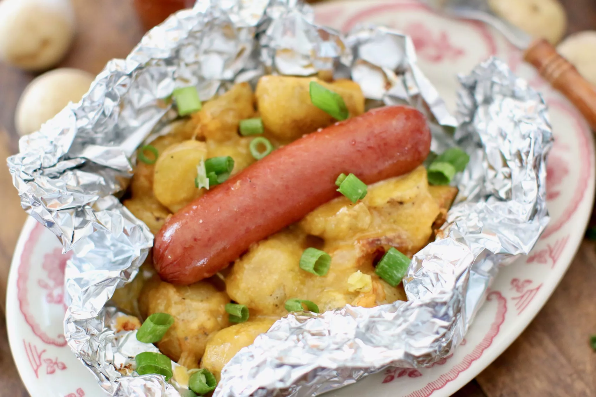 A baking sheet of the most delicious camping breakfast you could ever hope to have. Sausages, potatoes, peppers. Yum.