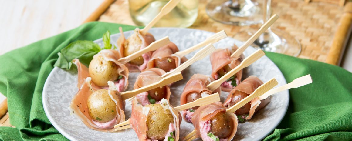 Spread one half teaspoon of the goat cheese mixture in the middle of a prosciutto slice. Place a potato on top of the goat cheese. Wrap the prosciutto around the potato and secure with a toothpick.